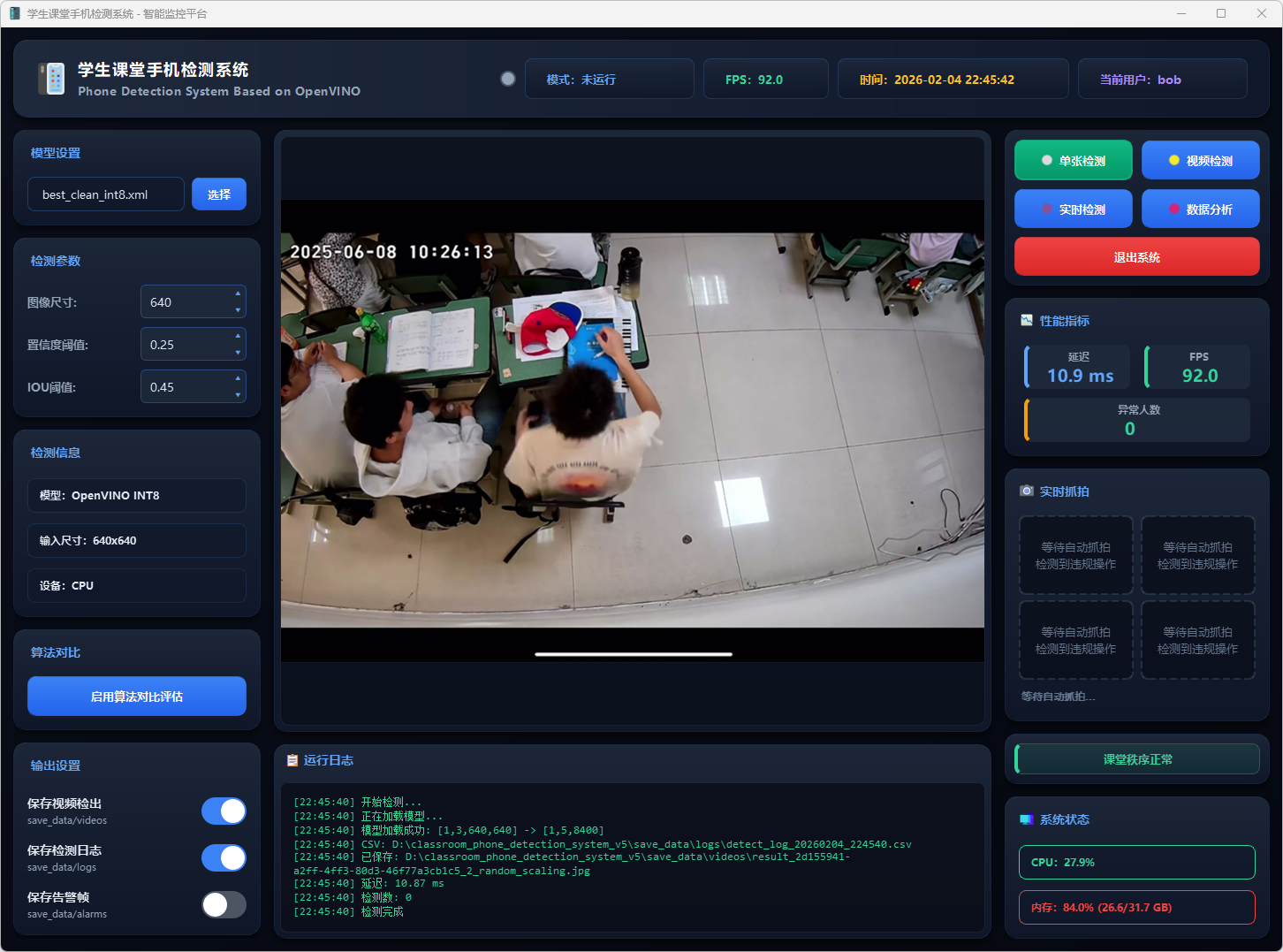 基于改进YOLOv5n与OpenVINO加速的课堂手机实时检测系统,支持单张图片、视频文件及摄像头多模式检测,可自动记录并导出检测结果。