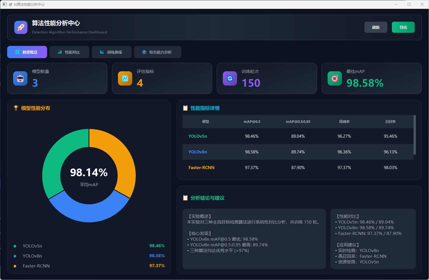 本系统采用 Python 3.12 开发,基于 YOLOv5 深度学习框架实现目标检测,使用 PyQt5 构建图形用户界面,结合 OpenCV 进行图像与视频处理,并通过多线程异步机制保障界面运行的流畅性。系统采用 SQLite 数据库实现识别数据的持久化存储与查询,整体架构清晰、模块化设计良好,便于后续功能扩展与维护。