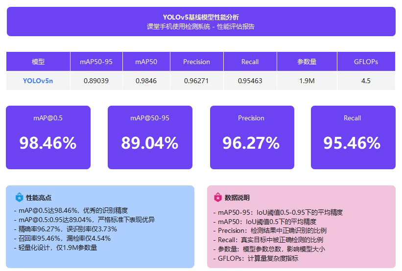 YOLOv5n 基线模型在仅 1.9M 参数量和 4.5 GFLOPs 计算量的条件下,在课堂手机使用检测任务中取得了 98.46% 的 mAP@0.5 和 89.04% 的 mAP@0.5:0.95,精确率与召回率分别达到 96.27% 和 95.46%。模型在 150 轮训练过程中表现出良好的收敛稳定性,整体性能提升幅度达 45.69%,同时支持 GPU 加速与 CPU 端部署,在保证检测精度的前提下兼顾轻量化与实时性,适合在边缘设备上部署,为课堂手机使用行为监测提供了一种高效可靠的技术方案。