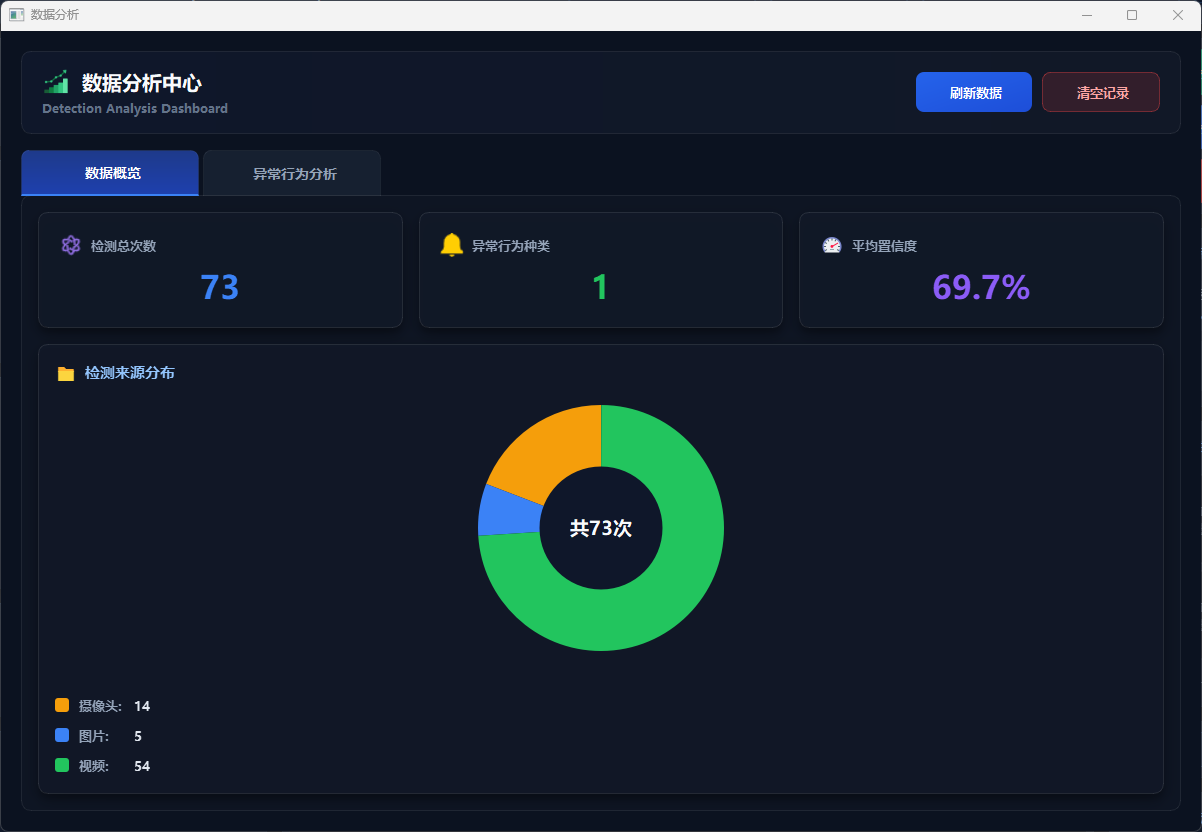数据分析模块提供识别数据的可视化展示与统计分析功能。用户点击"数据分析"按钮即可打开独立分析窗口,查看检测总次数、检测频次、平均置信度等关键指标,并通过条形图、饼图和统计卡片等形式直观展示数据分布。模块包含数据概览、检测分析和详细统计等标签页,支持查询存储于 SQLite 数据库中的历史识别记录,查看检测来源分布(视频、摄像头、图片),并支持清空当前用户记录,实现识别数据的持久化存储与综合分析。