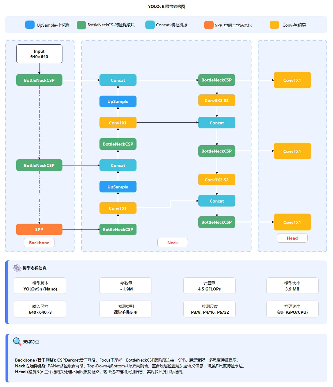 本系统采用 YOLOv5n(Nano)模型作为核心目标检测算法。YOLOv5 采用经典的 Backbone--Neck--Head 三段式网络架构,其中在 Backbone 部分,输入尺寸为 640×640 的图像首先经过卷积下采样操作,并基于 CSPDarknet 骨干网络逐步降低特征图分辨率、提升通道维度,实现从低层纹理信息到高层语义信息的多尺度特征提取;在 Neck 部分,采用 PANet 路径聚合网络结构,通过自顶向下与自底向上的双向特征融合机制,有效增强不同尺度特征之间的信息传递能力;最终在 Head 端输出 P3/8、P4/16 和 P5/32 三个尺度的特征图,分别用于小目标、中目标和大目标的检测,从而实现对课堂场景中手机目标的精准检测,为课堂手机使用行为分析提供技术支撑。