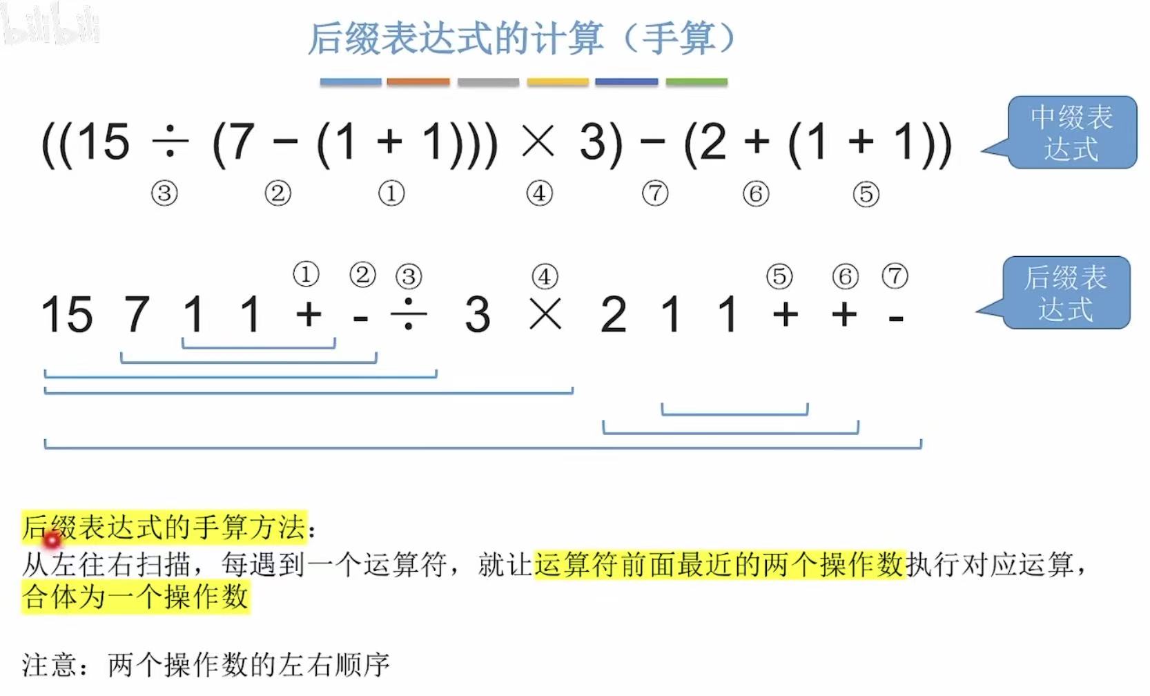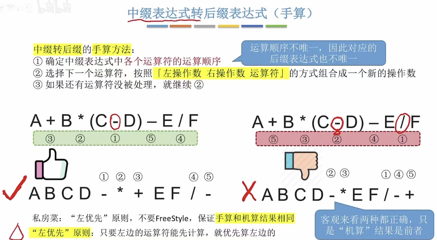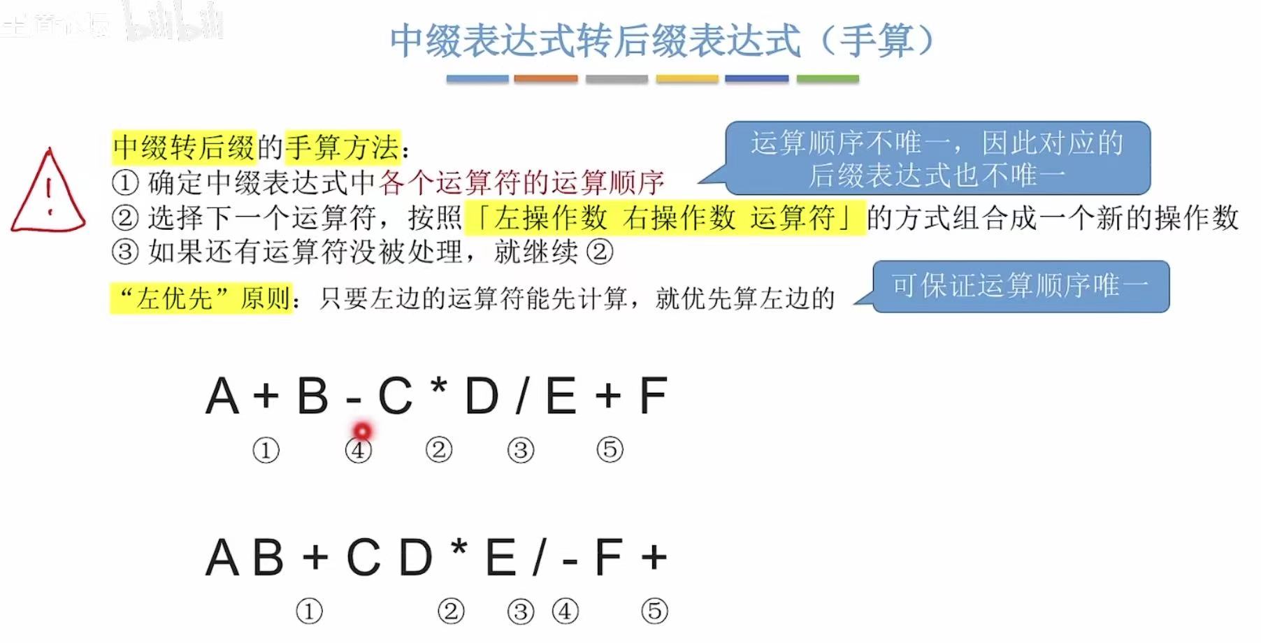 - 运算顺序不唯一,因此对应的后缀表达式也不唯一