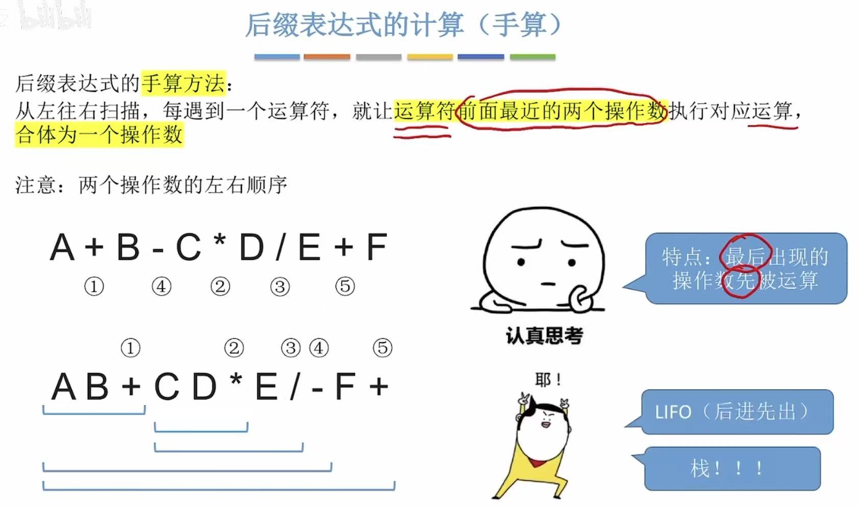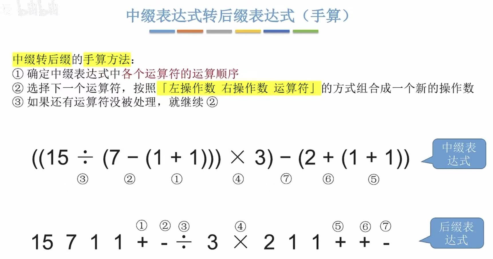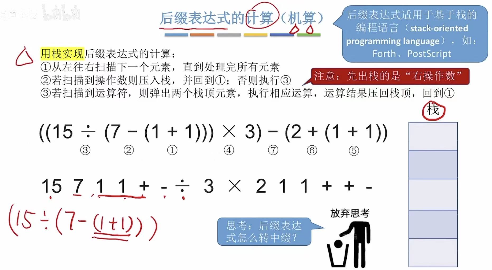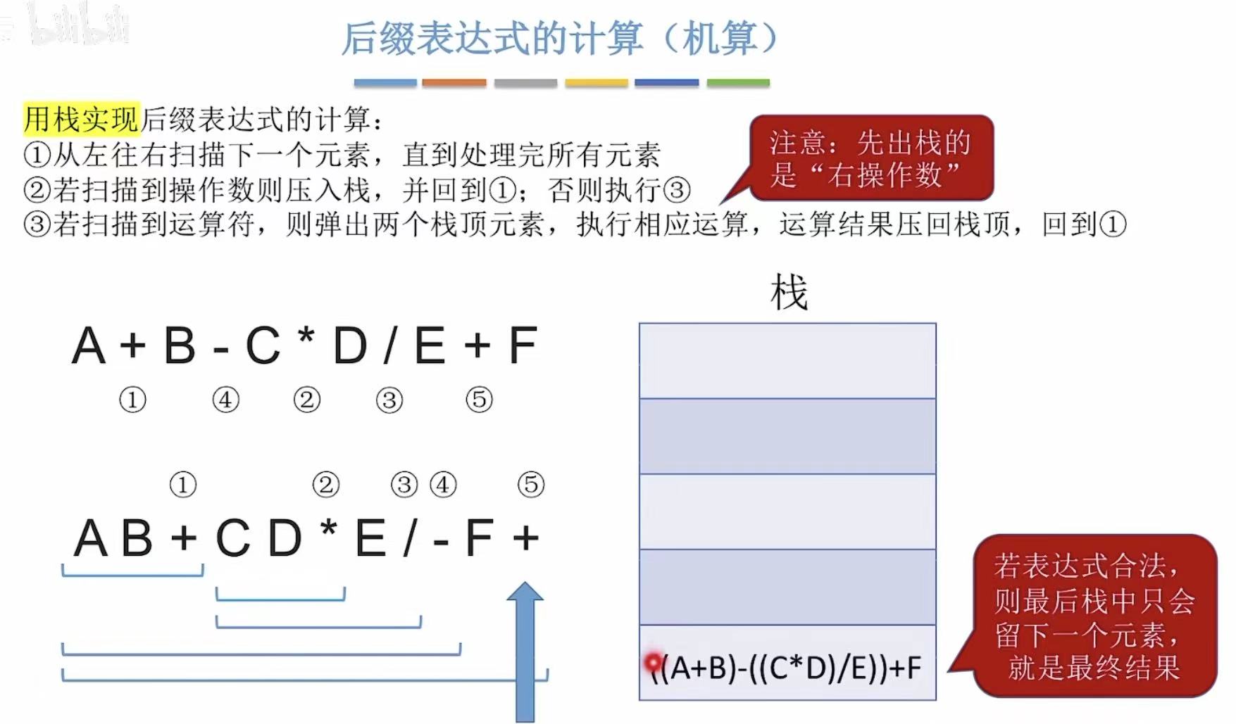 - 运算顺序不唯一,因此对应的后缀表达式也不唯一