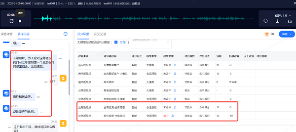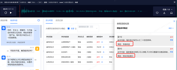 2.基于大模型语义理解的"分层展业违规"智能体:通过对接客服人员的资质信息(如投顾、非投顾),并结合大模型的深度语义理解能力,完美解决小模型难以实现的分层展业质检,及时发掘越界展业行为;