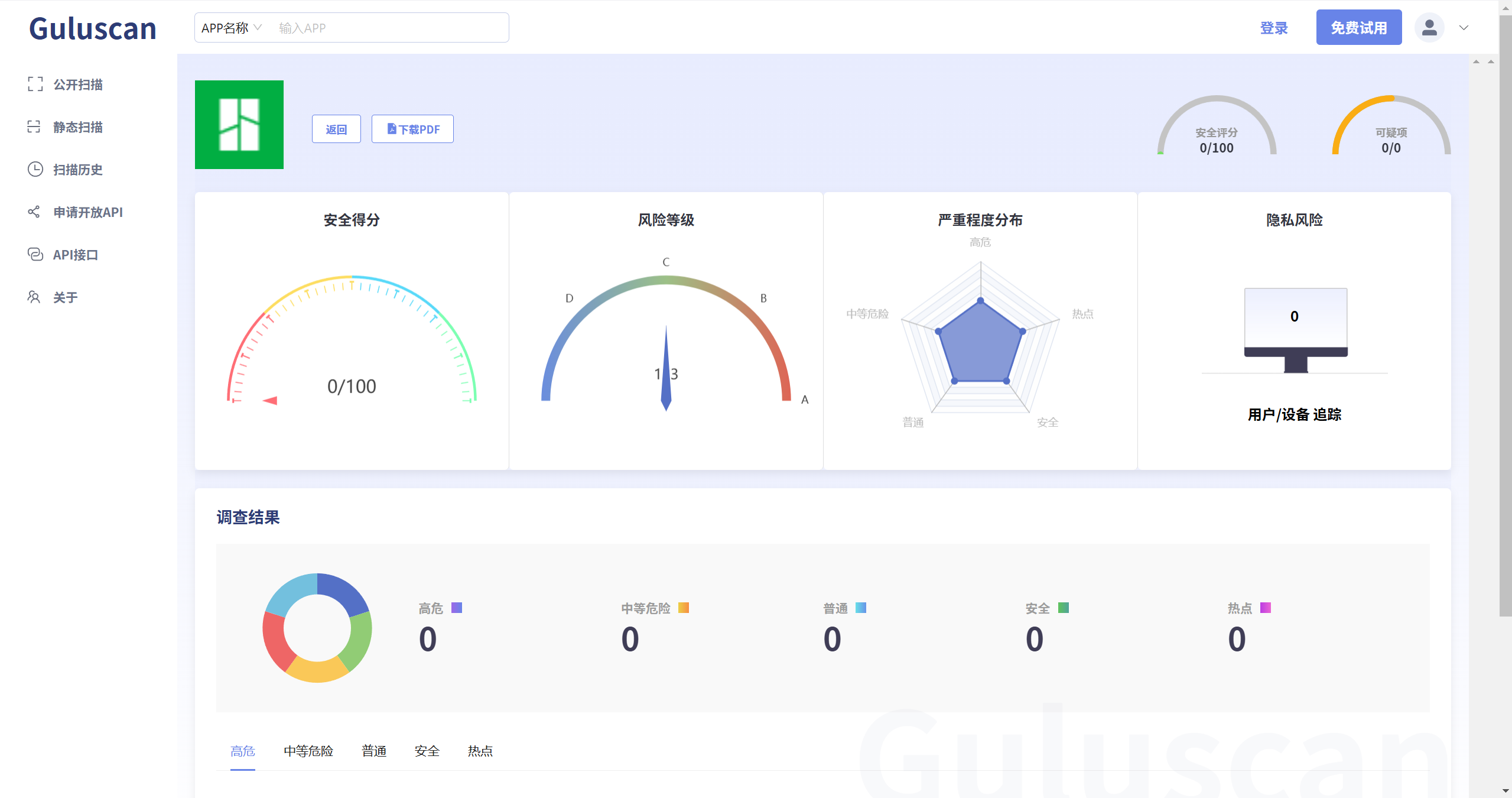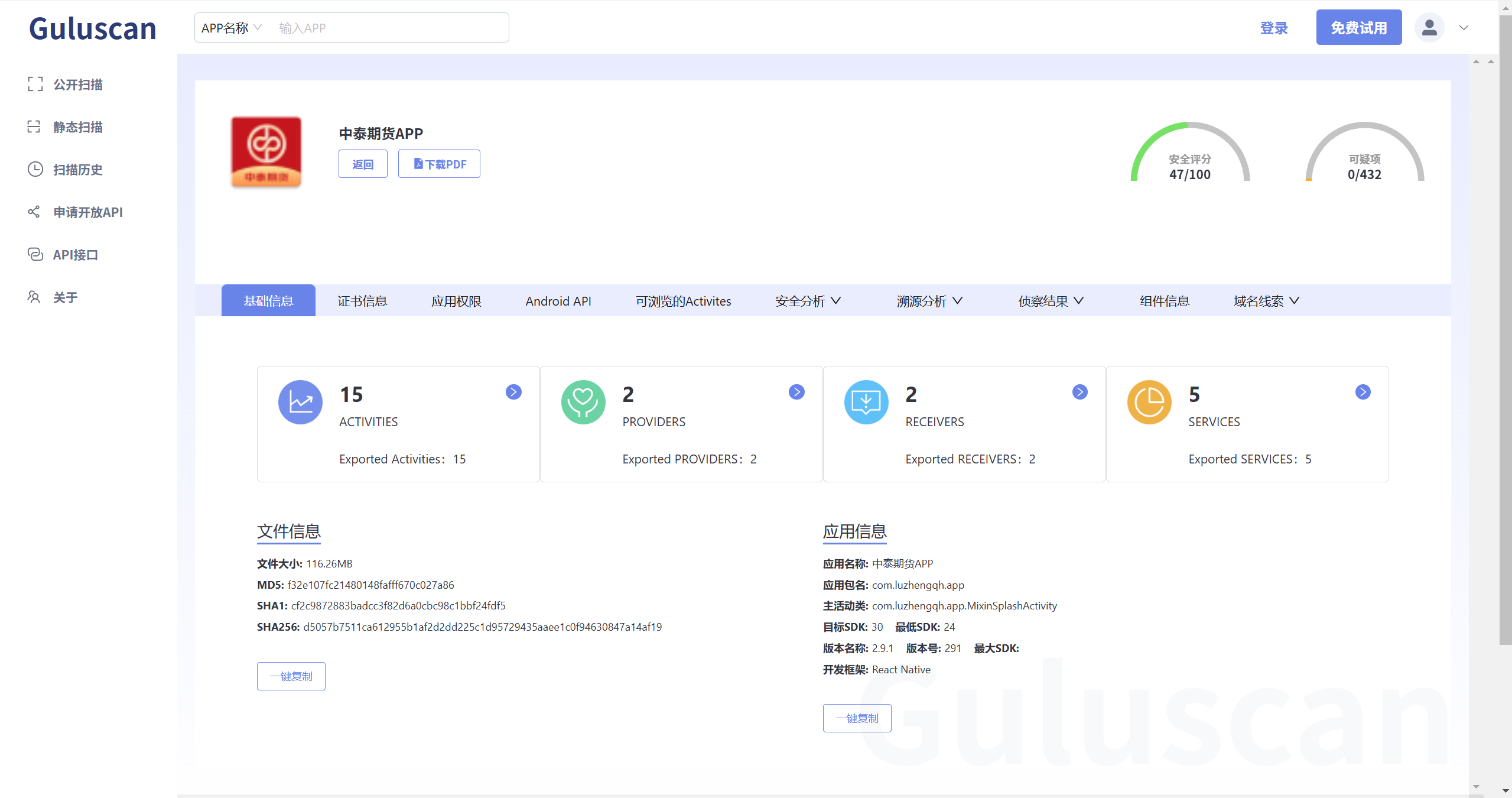 ● 或选择查看静态分析报告,静态分析报告包含应用基础信息,证书信息,应用权限等数据