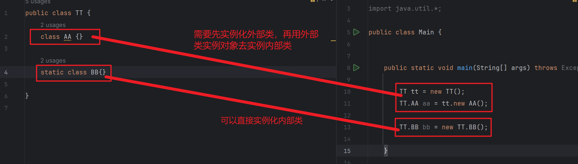 - 实例依赖:静态内部类可独立实例化 ,非静态内部类需先实例化外部类;