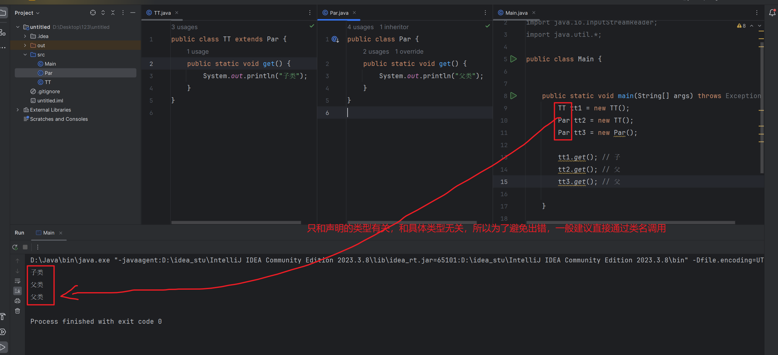 **多态性:**静态方法不支持重写,因为重写是在运行阶段,静态加载是在类阶段;其次就是静态方法执行的时候只看声明类型,不看具体类型