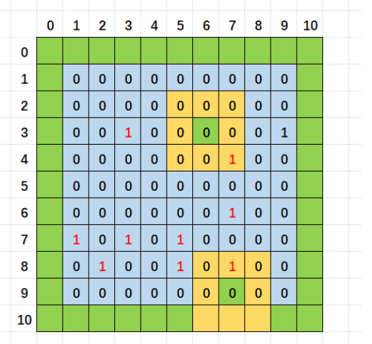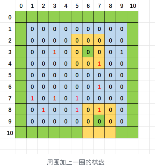 在布置雷后,寻找周围的雷的数量,为了数组不越界访问:可以设置一个11*11的棋盘。