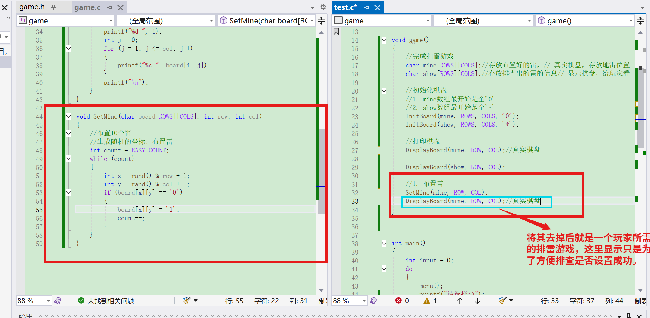 char mine[ROWS][COLS];//存放布置好的雷,// 真实棋盘,存放地雷位置