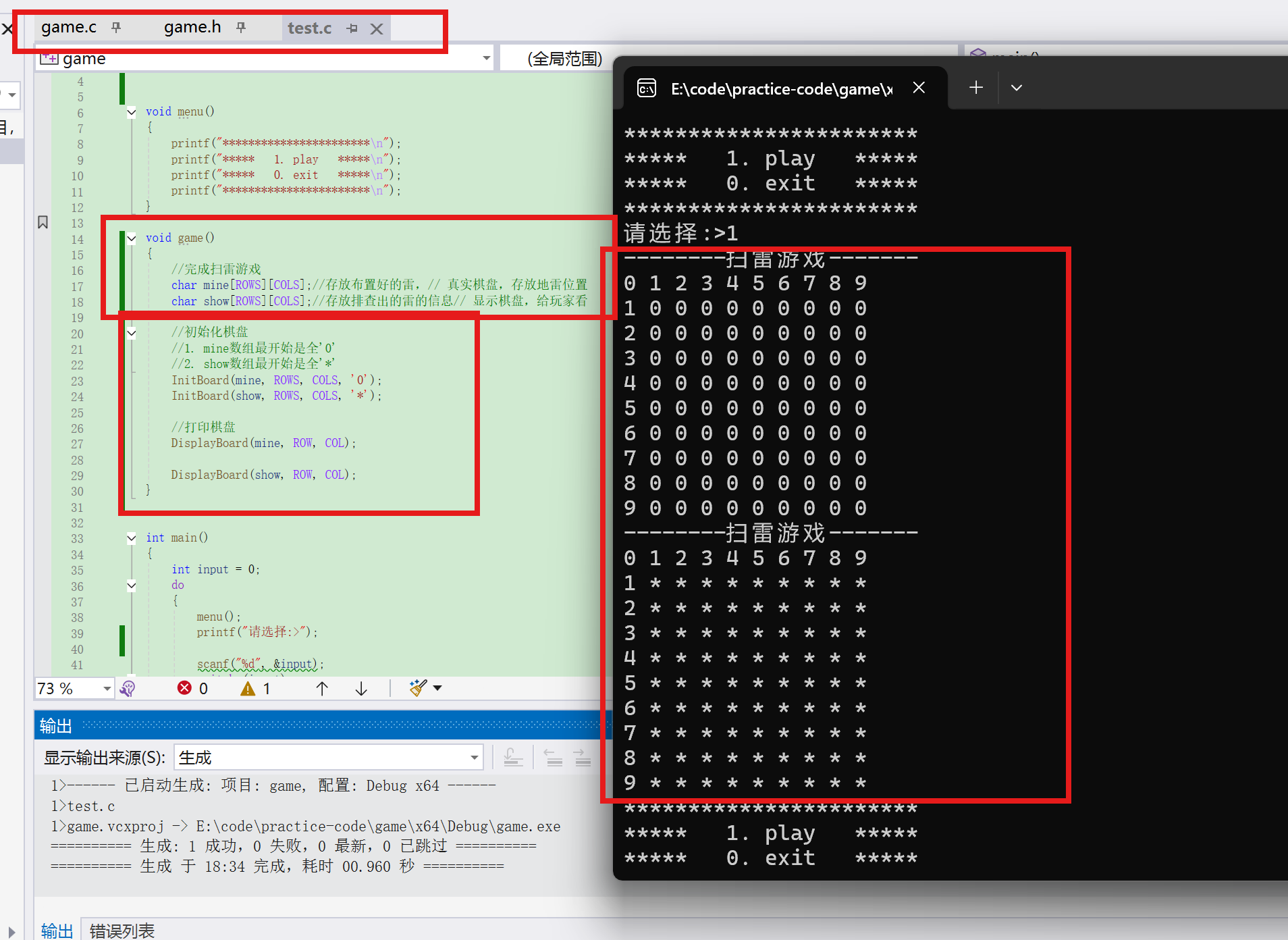 两个棋盘是一样的类型(都是 char 数组)对 mine棋盘(隐藏棋盘)进行操作和计算把结果"映射"到 show棋盘(显示棋盘)上显示给玩家。【两个棋盘是一样的类型,为了方便操作与区分,在看不到的棋盘进行操作后,把它显示到玩家能看得到的棋盘上。就像考试时,老师有答案+试题,而学生只有试题。】