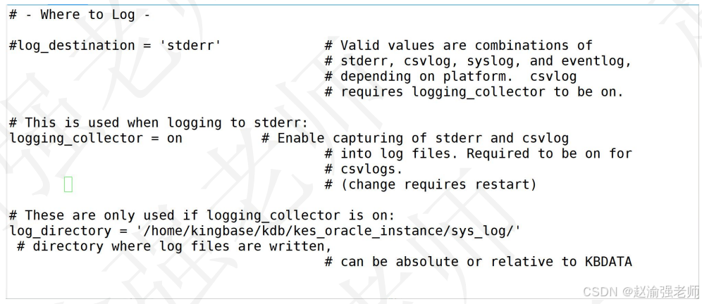 在默认的情况下,运行日志没有开启。通过查看主kingbase.conf文件的配置可以看到相关的参数设置,开启后会自动生成该日志文件。运行时日志一般是记录数据库服务器与数据库的状态,比如各种错误信息、定位慢查询SQL、数据库的启动关闭信息、发生检查点过于频繁等的告警信息等等。该日志有.csv格式和.log格式,建议使用.csv格式。因为.csv格式一般会按大小和时间自动切割。sys_log是可以被清理删除、压缩打包或者转移,同时不影响数据库的正常运行。当有遇到数据库无法启动或者更改参数没有生效时,第一步就可以查看运行时日志。下图展示了主参数文件kingbase.conf中关于运行日志的配置参数。