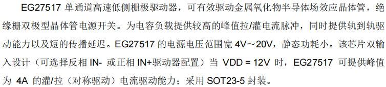 EG27517 以其 "4A对称峰值电流"、"同相/反相可配置输入" 与 "SOT23-5微型封装" 的独特组合,在高速低侧驱动芯片领域中树立了新的性能标杆。