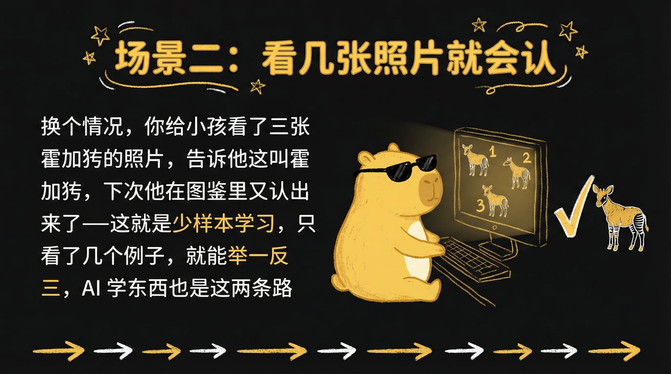 换个情况,你给小孩看了三张霍加狓的照片,告诉他这叫霍加狓,下次他在图鉴里又认出来了,这叫少样本学习------只看了几个例子,就能举一反三