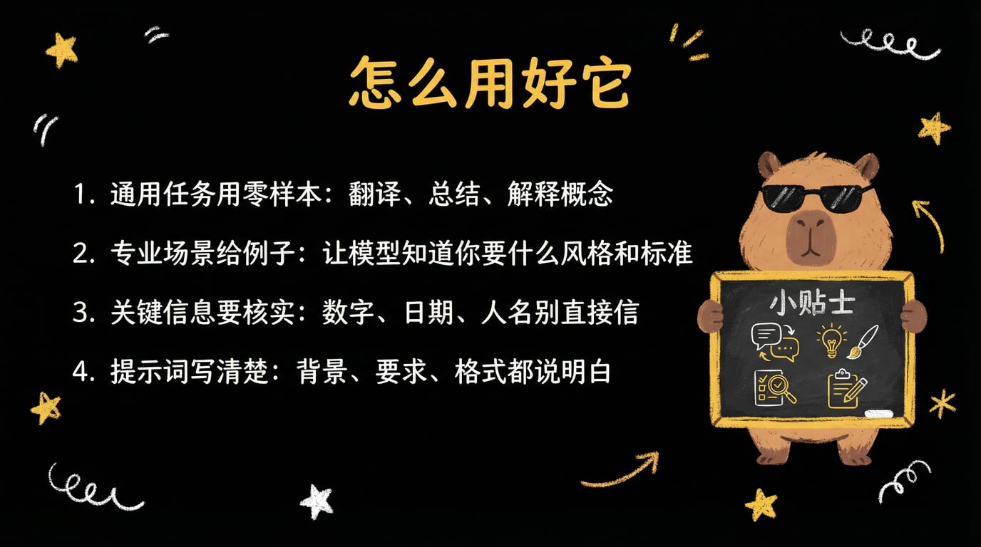 第四,提示词写清楚,零样本的效果很大程度上取决于你怎么问,问题模糊,答案也模糊,把背景、要求、期望的输出格式写明白,模型发挥的空间就大