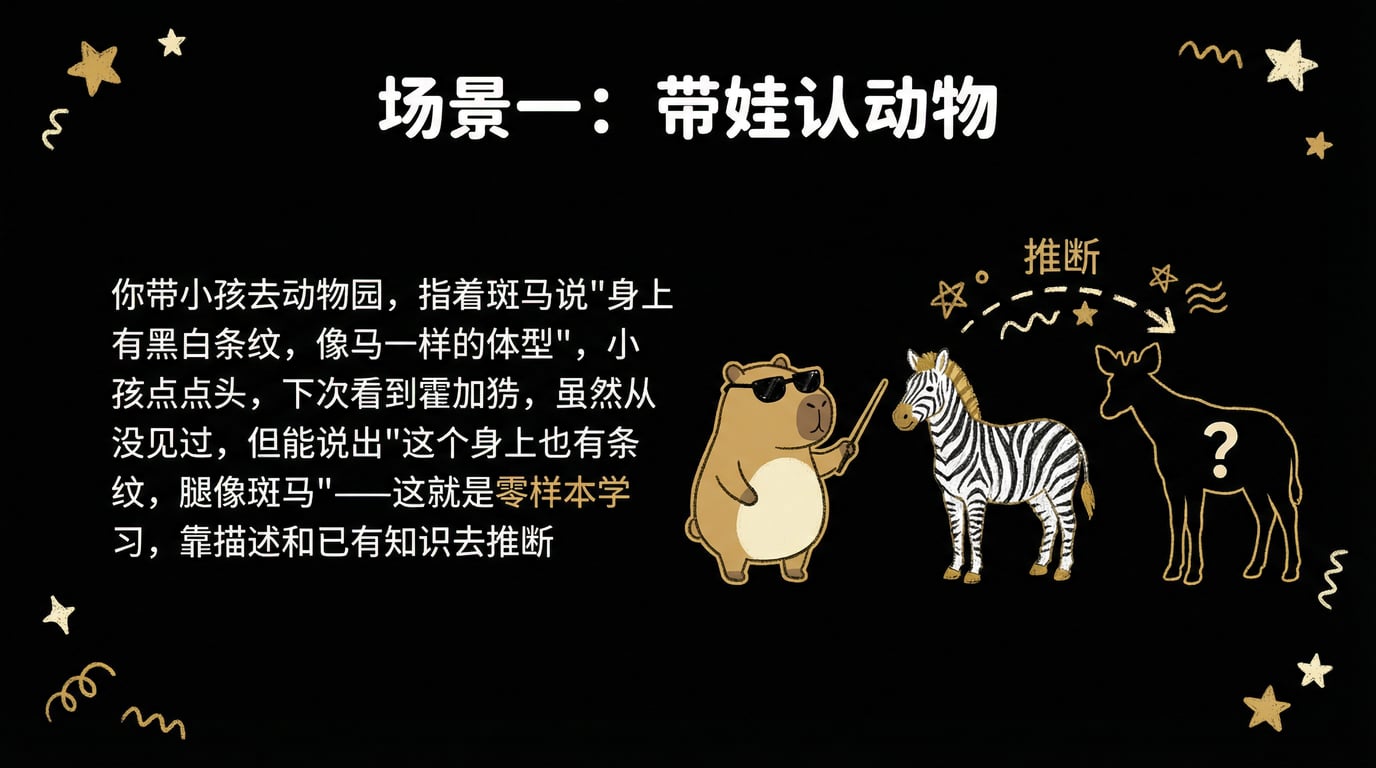你带小孩去动物园,指着斑马说,"这是斑马,身上有黑白条纹,像马一样的体型",小孩点点头,下次看到霍加狓,虽然从没见过,但能说出"这个身上也有条纹,腿像斑马",这叫零样本学习------没见过实物,靠描述和已有知识去推断
