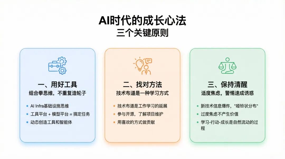 - 实践验证:看到一个新技术,先问"我能用它解决什么问题",然后去试一试,验证效果。