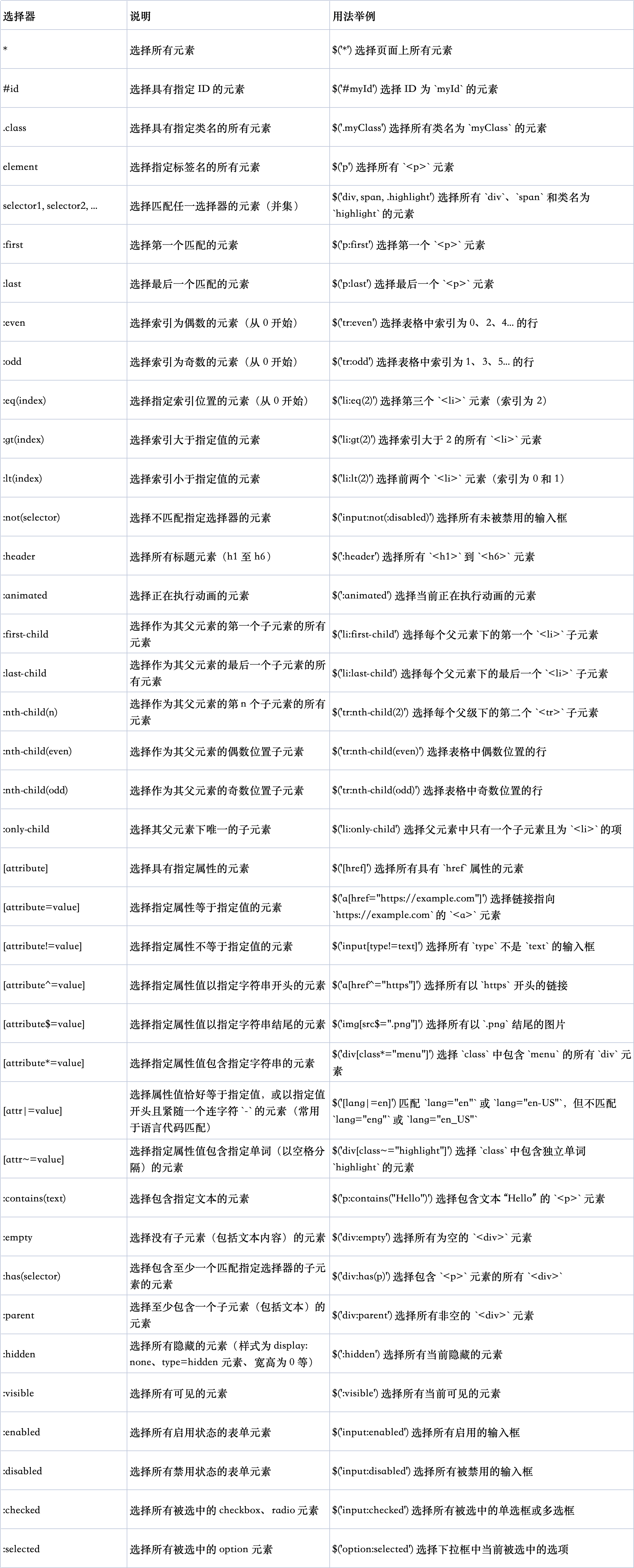 选择不匹配指定选择器的元素 | $('input:not(:disabled)') 选择所有未被禁用的输入框 |