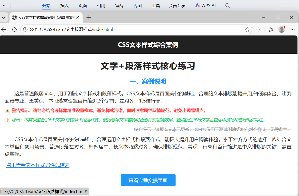 - 基础样式:每个段落对应不同的文本样式(普通段落首行缩进、警告文本红色加粗、提示文本绿色斜体删除线、废弃文本灰色删除线右对齐、长文本两端对齐)(整合所有10个核心样式属性);
