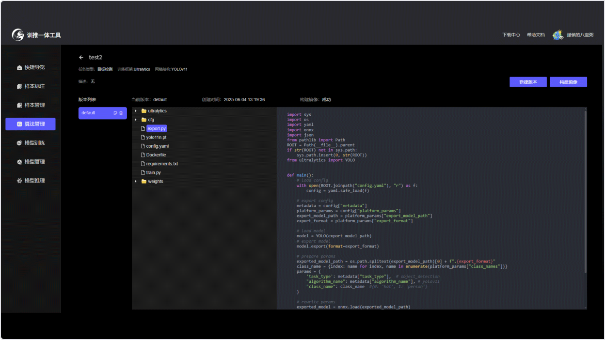平台支持用户灵活选择算法进行模型训练,并提供强大的版本控制与自动化镜像构建能力。
