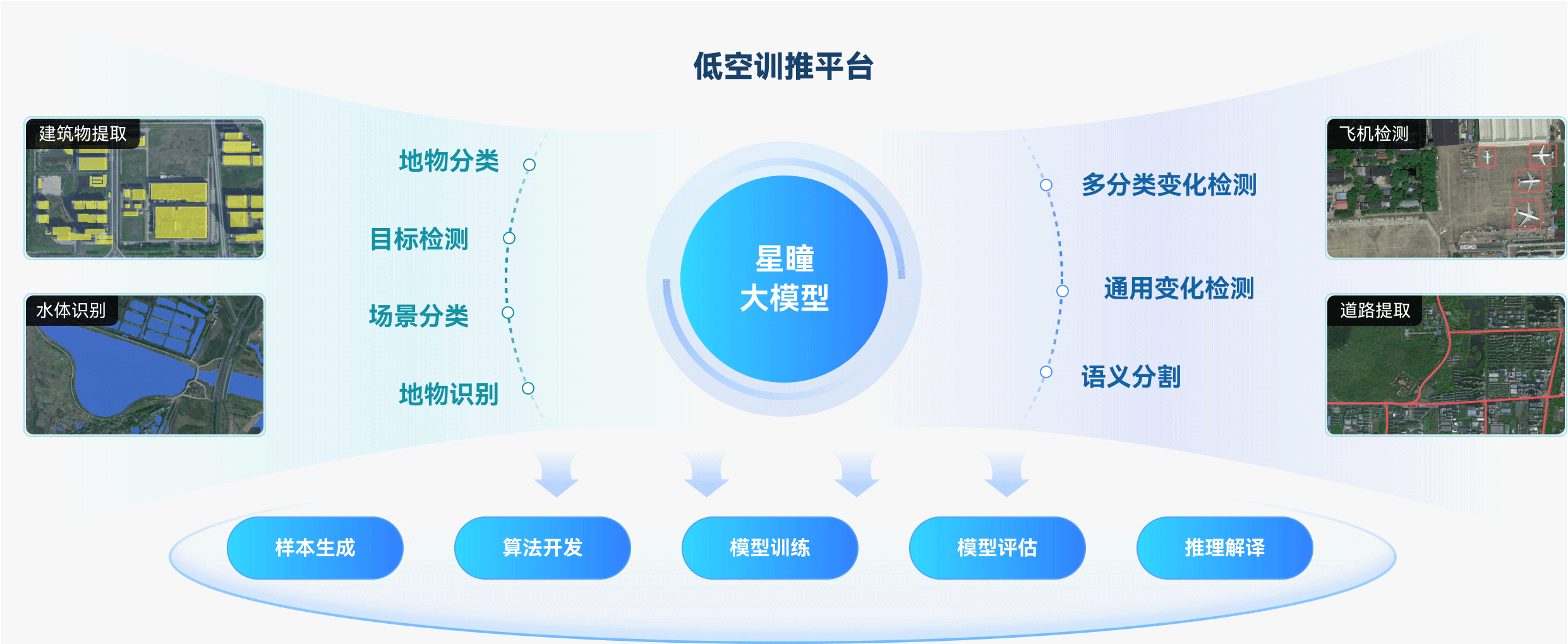 该平台内置星瞳大模型,适配边缘设备;预置低空算法与多尺度地物解析能力,支持0.01-10米遥感影像识别;集成高性能视频服务器,实现无人机巡检与交通监控实时分析。利用该平台对开源大模型展开训推,可显著缩短模型开发周期。