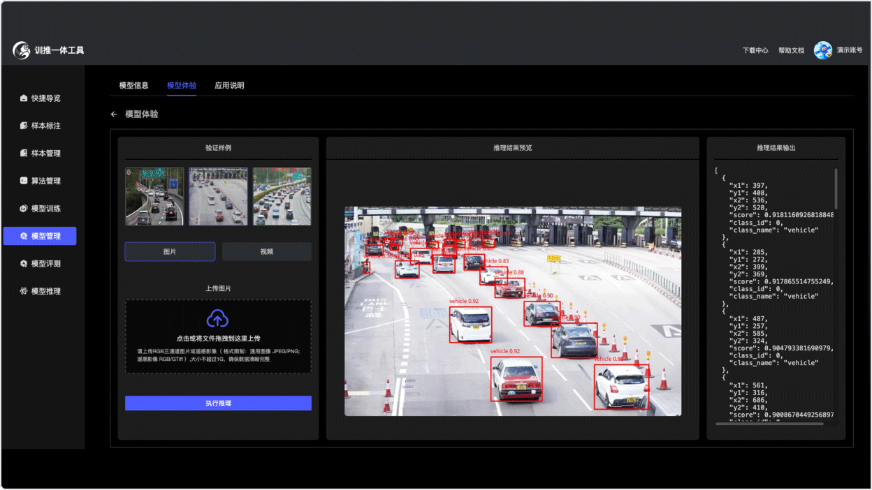 通过对模型性能的优化,平台能在保证精度的前提下,提升模型的推理速度。推理结果支持在线预览或本地下载,提供结果分析与可视化功能,帮助用户更深入理解模型输出,将推理结果无缝集成到工作流程中。