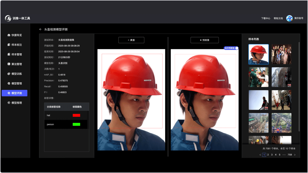 用户可以选择任何模型和评测样本集进行自动化评估。任务完成后,平台将集中展示关键核心指标和评测时长,提供直观的真值与预测值对比效果,支持用户逐个样本审视模型表现。