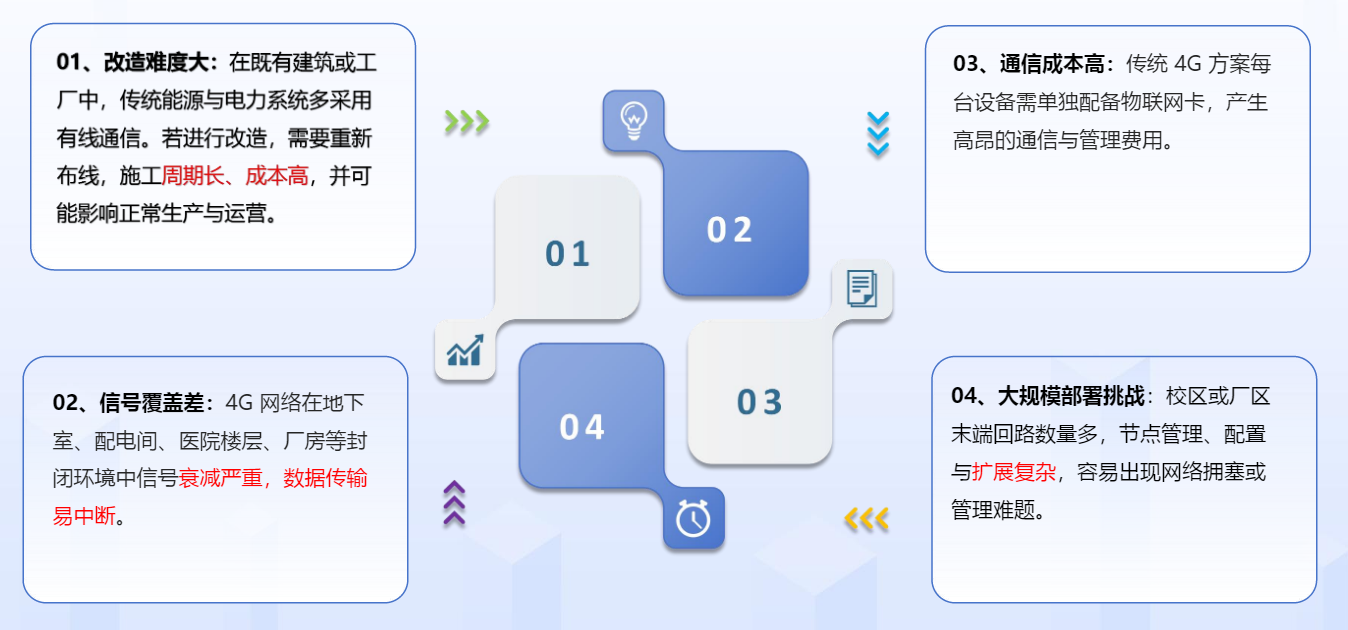 在企业推进电能计量与能源管理物联网化的改造过程中,前期实施阶段往往会遇到一些共性问题和挑战。传统方案 往往依赖RS-485有线布线或ZigBee短距离传输,导致布线成本高、覆盖盲区多、设备维护难;而蜂窝网络方案 (4G/5G)虽覆盖广,但功耗高、资费贵,难以支撑海量电表7×24小时持续在线。如何在"低成本覆盖"与"低功耗运行"之间找到平衡点,成为企业能源数字化改造的关键命题。