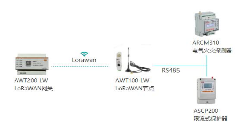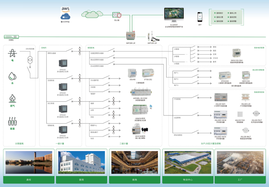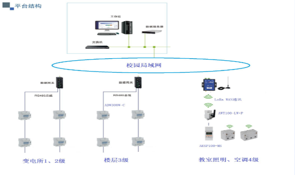 项目采用"RS-485有线+LoRaWAN无线"混合组网方案,在变电所及楼层配电箱部署ADW300仪表经ANET网关接入校园网,在教室照明空调末端安装用电精灵通过LoRa信号汇聚至LoRaWAN网关,经学校VPN远程访问虚拟服务器,并部署EMS能源管理系统实现电力监控、电能管理、能耗监测及运维管理一体化。