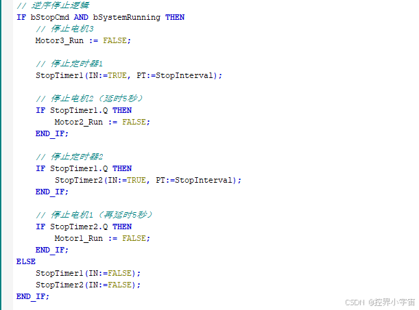 - 停止逻辑与启动相反,先停最后启动的Motor3,再依次向前停止;
