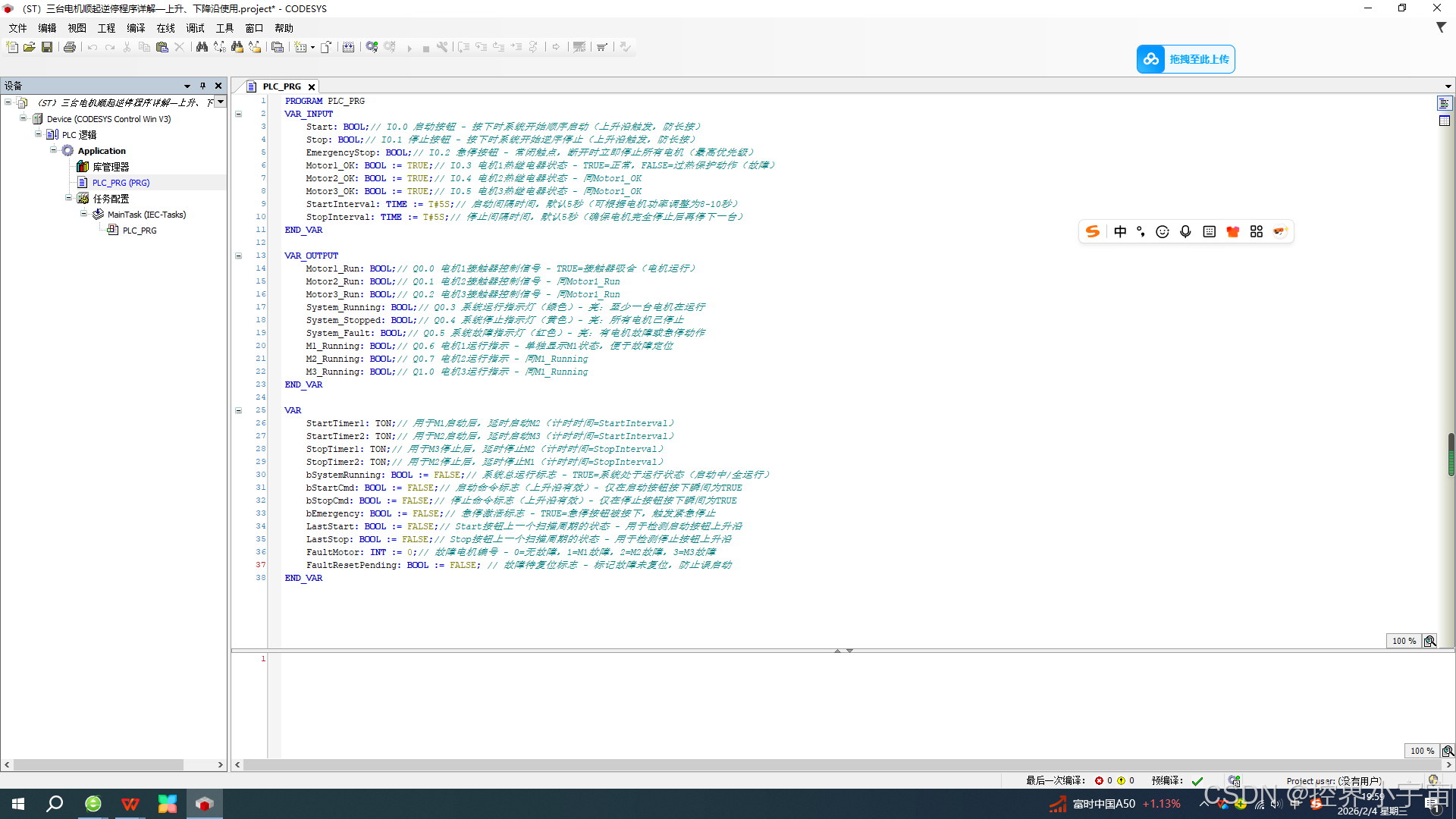 本文将基于CoDeSys平台,详细拆解三台电机顺起逆停程序的设计思路、变量定义、梯形图逻辑(带逐网络注释)、安全特性及调试方法,全程附带详细注释,新手可直接参考学习、复用,快速掌握多电机顺序控制和定时器、标志位的综合应用。