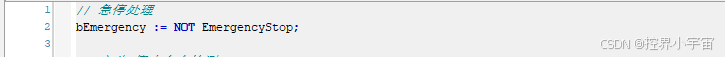 - 工业现场的急停按钮通常采用常闭触点 (正常状态为TRUE,按下后为FALSE),因此通过NOT取反,使bEmergency=TRUE表示急停触发;