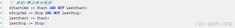 - 边沿检测原理:仅当当前周期信号为TRUE,且上一周期信号为FALSE时,bStartCmd/bStopCmd才为TRUE(仅触发一次);