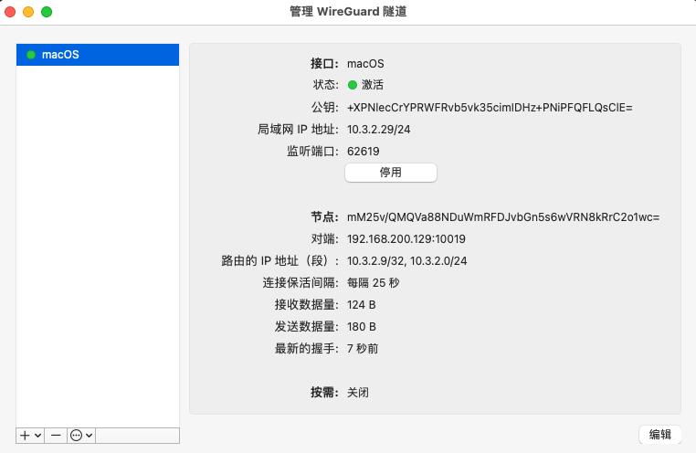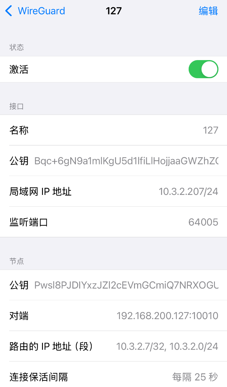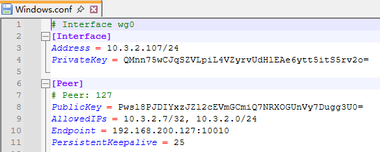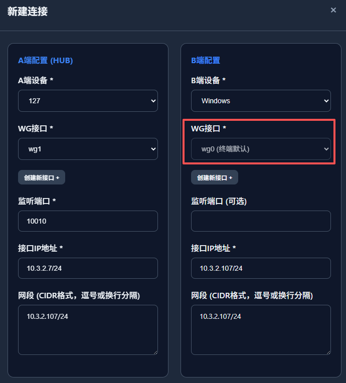 对于终端节点,同样是只能出现在B端配置中,仅保留一个WG接口;其他的监听端口同样为可选配置,应该一般都不配;还有接口IP地址和网段选项,可以正常配置。