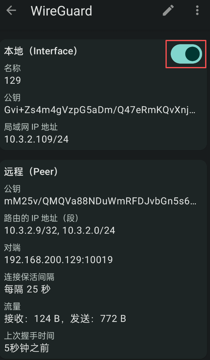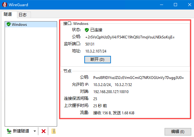 识别到配置之后,配置一个连接名称,再单击右上角的开关发起连接就可以了。连接成功的页面如下所示: