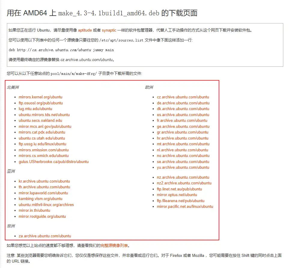 我们再来查看需要下载老版本的情况。实际上我们查看一开始的报错信息就能看到其实已经给我们指定了应该下的版本(也就是4.2.1-1.2)。在前面的下载页面中我们也很容易找到这句话:您可以从以下任意站点的 pool/main/m/make-dfsg/ 子目录中下载所需的文件