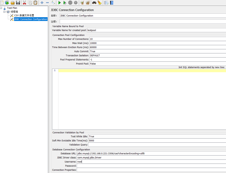 在Jmeter线程组下继续添加JDBC Connection Configuration元件,并且设置好MySQL数据库的相关配置信息,如下图所示。