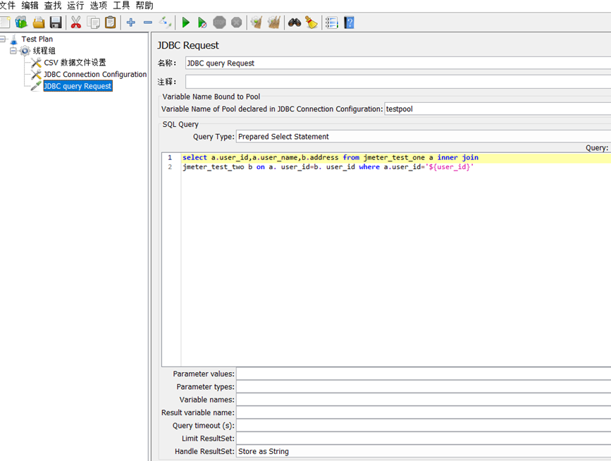 在JDBC Request 取样器中配置要做性能压测的SQL语句select a.user_id,a.user_name,b.address from jmeter_test_one a inner join