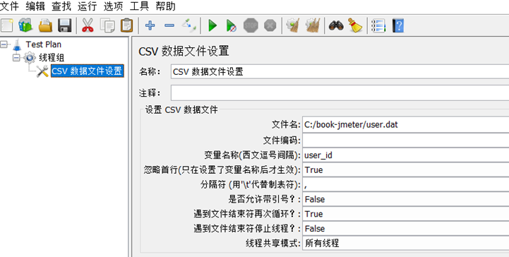 在Jmeter测试计划的线程组中添加配置元件下的CSV数据文件设置元件来设置参数化的数据,如下图所示,在CSV数据文件设置中,选择user.dat文件所在的路径,并且将变量名称设置为user_id。