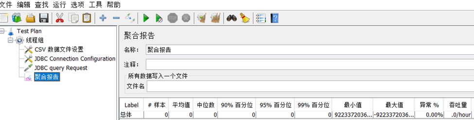 最后,我们添加聚合报告用于观察对MySQL数据库查询进行性能测试时的各项性能指标的展示,如下图所示。