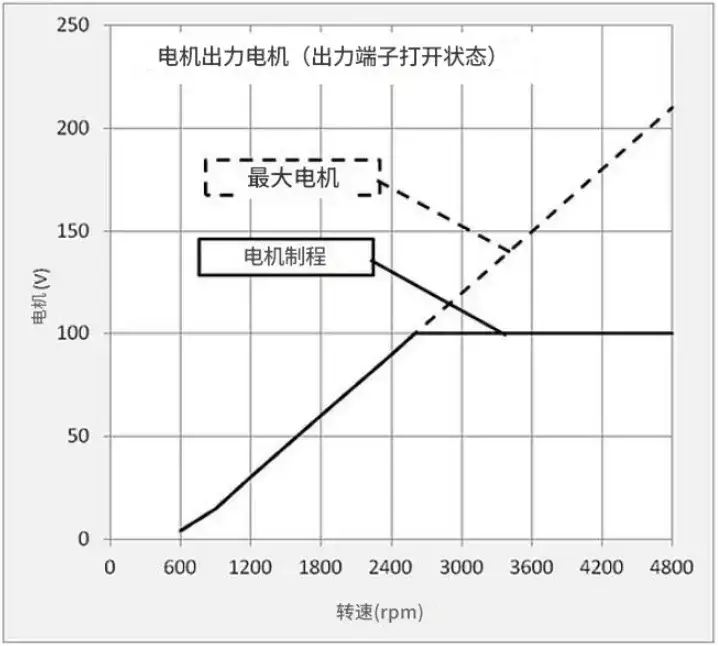 输出端电压随转速的增加而增加。在额定转速 3000 rpm 和 3600 rpm 时,发电机侧控制装置(如图 1 中的虚线所示)会自动将其控制在 100 V(参见图 2 )。