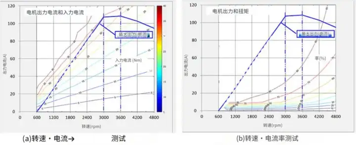 部分负载性能的测量方法是在每个转速下,从 0 A 开始逐步增加负载电流。通过测量每个转速和电流下的输入转矩,可以得到如图 4 (a)所示的转速、电流和输入转矩关系图。然后,通过计算输出功率/输入功率,可以得到如图 4 (b)所示的效率关系图。