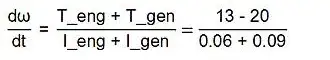 例如:如果发动机旋转部分的转动惯量为 0.06 kgm 2,发电机旋转部分的转动惯量为 0.09 kgm 2,发动机输出扭矩为 13 Nm,发电机吸收扭矩为 -20 Nm,则根据以下公式,旋转加速度将为 -46.7 (rad/sec 2 ),即每秒减速度为 445 rpm。