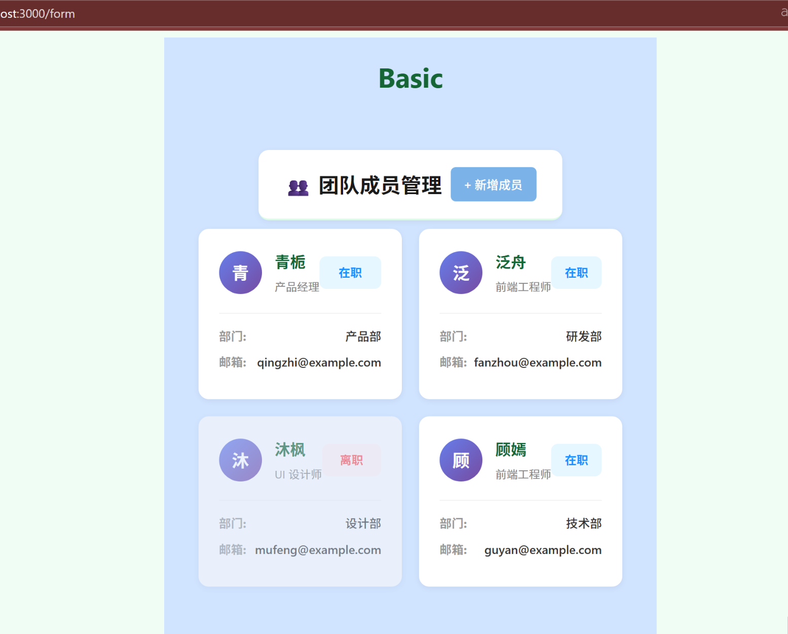 以网格布局展示团队成员信息,支持根据状态(在职/离职)区分样式。