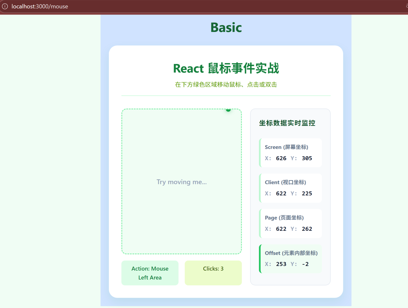 `onMouseMove`、`onClick`、`onDoubleClick`、坐标计算。