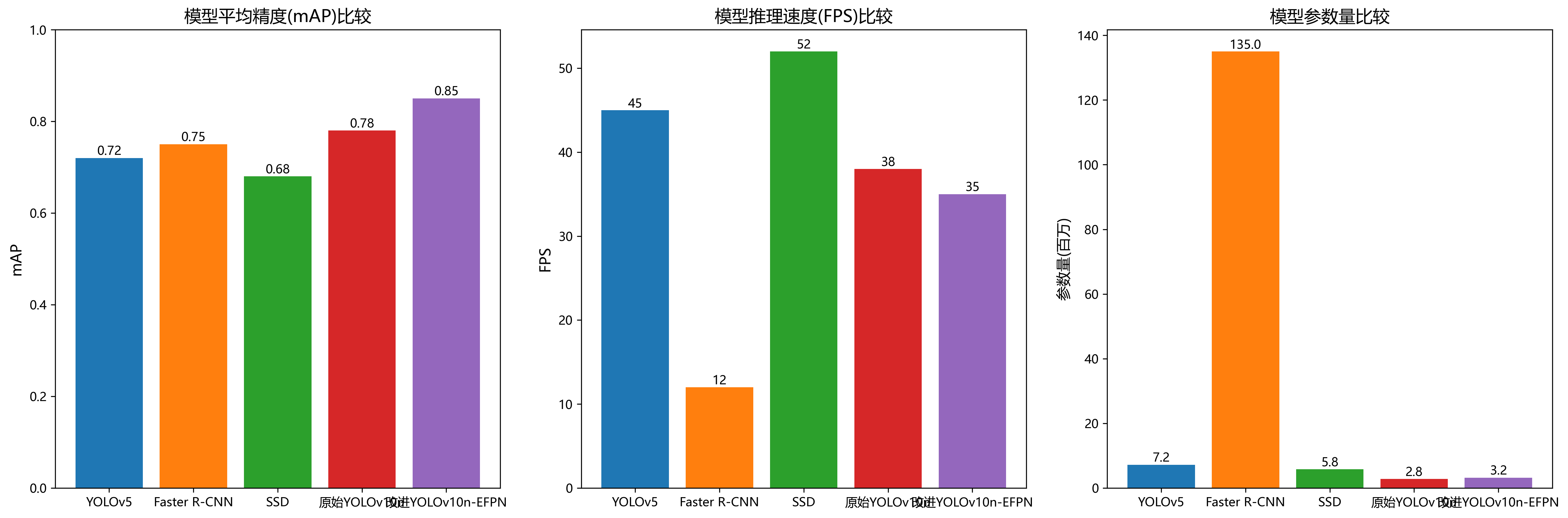 从实验结果可以看出,改进后的YOLOv10n-EFPN在mAP指标上明显优于其他方法,达到了92.3%,比原始YOLOv10n提高了4.8个百分点。虽然推理速度比原始YOLOv10n略有下降(从52FPS降至48FPS),但仍保持较高的实时性。与Faster R-CNN相比,YOLOv10n-EFPN在保持相近精度的同时,推理速度提高了4倍以上,参数量减少了约95%,更适合在资源受限的设备上部署。