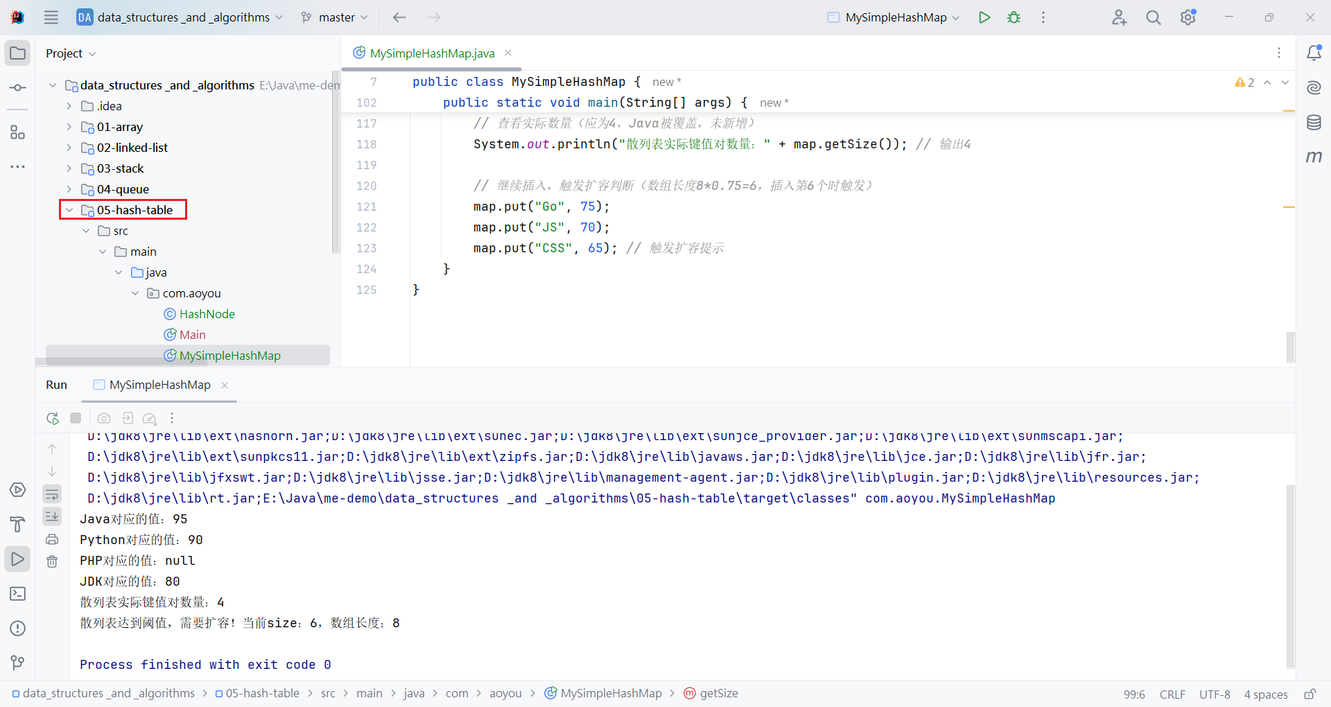 System.out.println("散列表实际键值对数量:" + map.getSize()); // 输出4