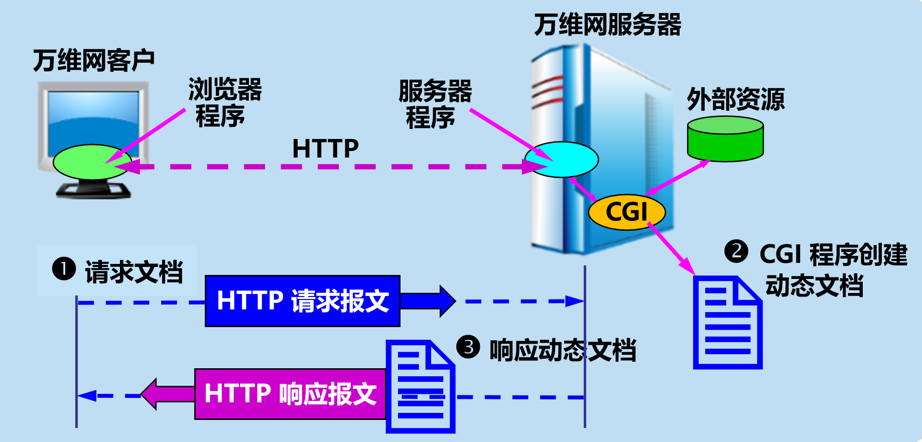 - 当用户在Web浏览器中请求一个CGI程序时,Web服务器会将请求传递给相应的CGI脚本。脚本执行完成后,将结果返回给服务器,服务器再将结果传给用户的浏览器