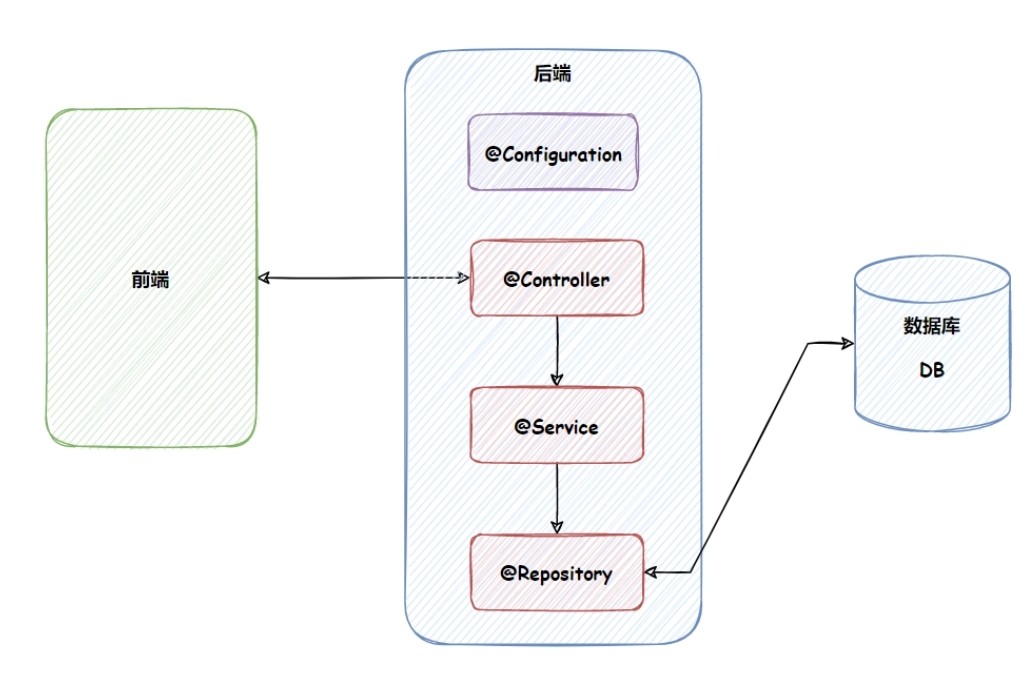 浏览器发起请求, 先请求Controller, Controller接收到请求之后, 调用Service进行业务逻辑处理, Service再调用Dao