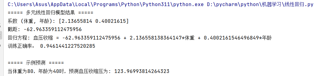 print(f"当体重为80kg,年龄为40岁时,预测血压收缩压为: {predicted[0]:.2f} mmHg")