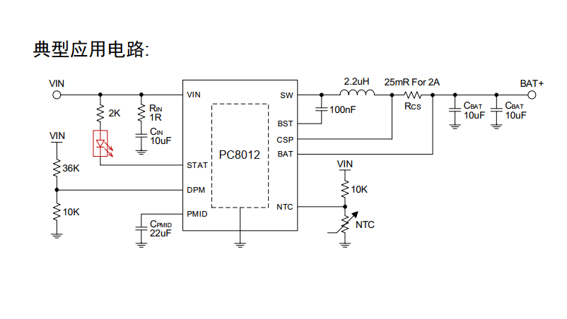 PC8012 是一款支持 4.5-15V 输入电压范围,最大输出为2A电流的同步降压锂电池充电管理芯片。芯片内部集成了低阻功率 MOSFETS,采用500kHz 的开关频率以实现较小的元件尺寸和较高的充电效率。PC8012 内部还集成了多重保护功能,能够最大程度的保护芯片和终端设备。可通过调节恒流电阻的阻值改变电池恒流模式下的充电电流大小。芯片内置有输入DPM功能,通过外置分压电阻设置不同的保护阈值电压,以匹配不同适配器。芯片集成温度调节环路,可以智能调节充电电流从而控制芯片温度。PC8012 还内置了充电状态显示功能,通过LED 的状态判断电池的工作状态。